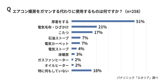 一方で、エアコンを控える代わりに使用するものは、「厚着をする」(51%)が圧倒的に多く、“着込んで寒さをしのぐ”節約行動が目立ちました。