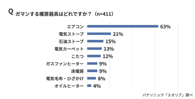 ・「ガマンする暖房器具」1位はエアコン(63%)、代わりに「厚着をする」51%