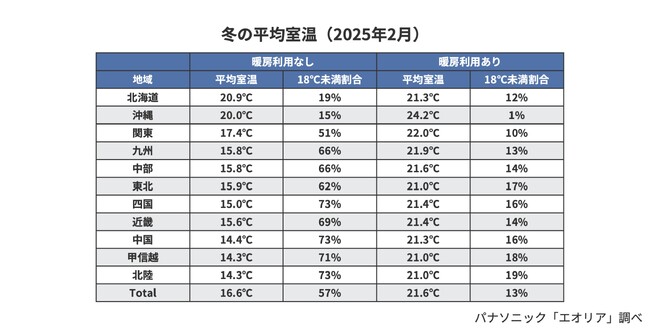 地域別に見ても、北陸・甲信越・中国は未使用時の室温が14℃台にとどまる一方で、暖房利用時には21℃前後まで改善し、健康的な室温環境に近づいていることがわかります。
