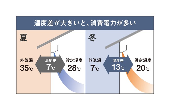 温度差が同じ場合でも、冷やすよりも暖めるほうが電力を消費するため、暖房運転のほうが消費電力が多くなり、電気代が高くなります。
