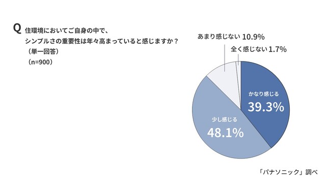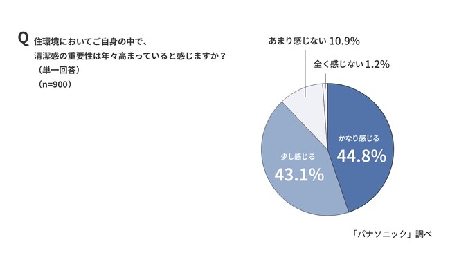 次に、住環境において「シンプルさ」、「清潔感」、「省スペースやコンパクトなもの」の重要性が高まっているかそれぞれ聞いたところ、「シンプルさ」は「かなり感じる」と「少し感じる」を合わせると87.4%と大半の方が重要性が年々高まっていると考え、「清潔感」についても87.9%の方が重要性が高まっていると感じている結果となりました。
