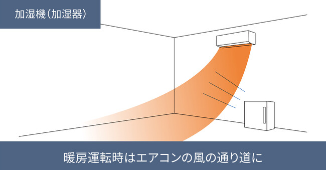 加湿機の加湿した空気を、エアコンの風に乗せて部屋全体に行きわたらせるイメージで設置しましょう。加湿機の吹き出す空気がエアコンにうまく合流するような「風の通り道」に置くのがポイントです。ただし、加湿機の湿度センサーの誤認を避けるために、加湿器本体に直接エアコンの風が当たらない位置に設置し※、エアコンの真下は避けましょう。