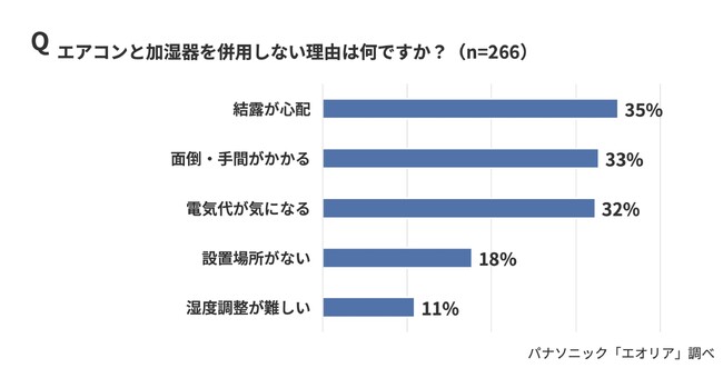 ・エアコンと加湿器を併用しない理由、「結露が心配」(35%)、「面倒・手間がかかる」(33%)、「電気代が気になる」(32%)が上位に