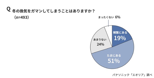 一方、「冬の換気をガマンしてしまうことがありますか?」とたずねたところ、「頻繁にある」(19%)、「たまにある」(51%)と、70%がガマンしてしまうことがあると回答しました。