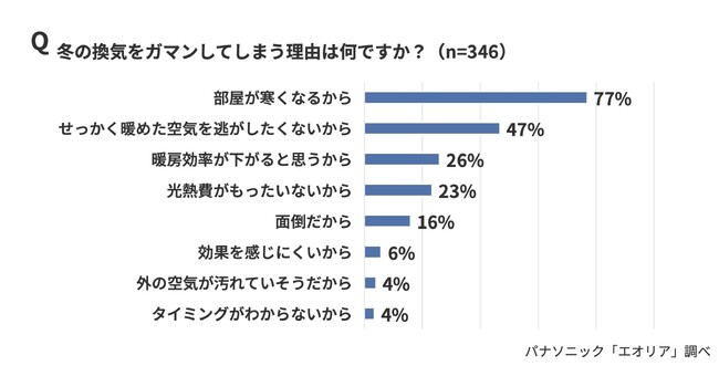 ・冬の換気をガマンする理由、「部屋が寒くなるから」(77%)、「せっかく暖めた空気を逃がしたくないから」(47%)が上位に