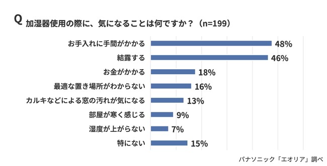 ・「加湿器を使用する際に気になること」では、「お手入れが手間」(48%)、「結露する」(46%)が上位に