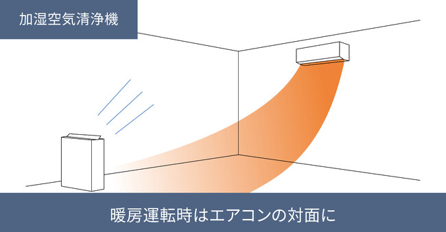 加湿空気清浄機は、エアコンの風とぶつかってしまうとお部屋の空気の循環の妨げとなってしまうため、ぶつからないように対面や対角線の壁に置きましょう。