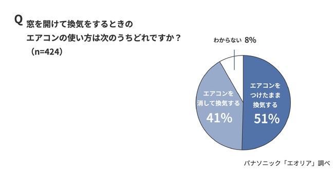 ・窓を開けて換気する際のエアコンの使い方、「つけたまま換気する」(51%)、「消して換気する」(41%)