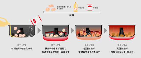 パナソニックのオートクッカー ビストロは、9月に「ビストロジューシーから揚げ」のレシピを公開しました。調味料をもみこんだ鶏もも肉、少量の油、片栗粉を入れてスタートするだけで、簡単にから揚げを作ることができます。鶏肉に粉をまぶす必要もなく、蓋をして調理するので油跳ねの心配もありません。少量の油で調理できるので、調理後の油の処理も不要です。<から揚げの調理工程>