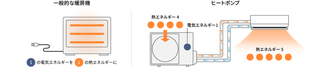 ヒートポンプとは、簡単に言うと「空気中の熱をくみ上げて、移動させる技術」です。エアコン暖房の場合は、室外機で外の熱を集め、室内に移動させることでお部屋を暖めています。