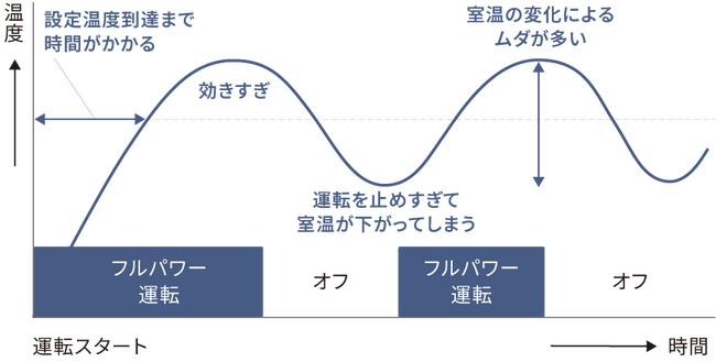 インバーター技術とは、ハイパワーと低パワー運転を切り替えて、ムダなく効率的に運転するための技術です。