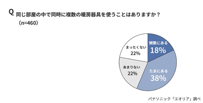 「同じ部屋で複数の暖房器具を併用することがあるか」を聞くと、「頻繁にある」(18%)、「たまにある」(38%)と、56%が暖房器具の併用を行っていると回答しました。