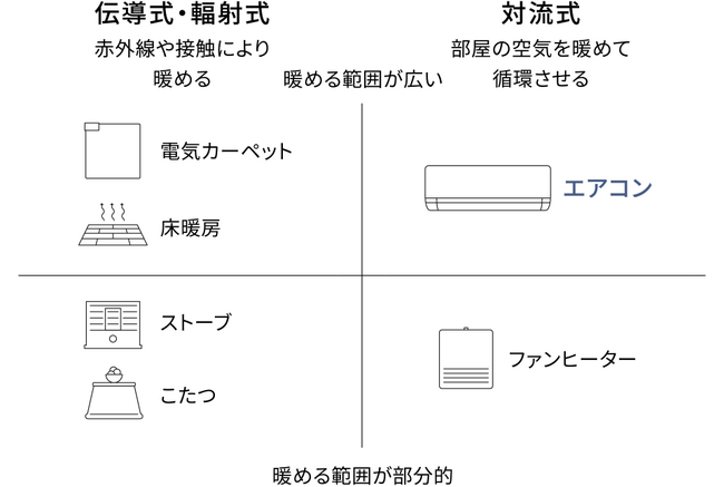 エアコンは空気を循環させて部屋全体を暖める「対流式暖房」。一方、電気カーペットやストーブ、こたつなどは赤外線や接触により暖める「伝導式・輻射式暖房」です。