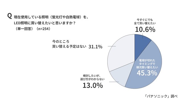 ■今後、蛍光灯からLED照明器具に買い替えを検討している人は約7割。しかし、「今すぐ」ではなく「電球が切れてから」という“消極的買い替え派”が約半数を占め、「まだ使えるものを捨てる」ことへの抵抗感が浮き彫りに。