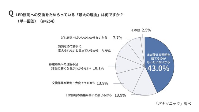 現在使用している照明(蛍光灯や白熱電球)からLED照明器具への買い替え意向を聞いたところ、「今すぐにでも」「電球が切れたタイミングで順次」「検討したいが、選び方がわからない」を合わせて68.9%が買い替えを検討していると回答しました。しかし、そのうち「電球が切れたタイミングで順次」という“消極的買い替え派”が45.3%と半数近くを占めています。また、買い替える予定がない方に交換をためらう理由を聞いたところ、「まだ使える照明を捨てるのがもったいないから」が43.0%で、使えるものを捨てることに対しての抵抗感が浮き彫りとなりました。