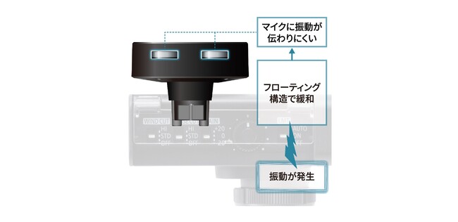 新開発のノイズ抑圧技術により、さまざまな環境でノイズを抑えた収音を実現します。音質を保ちながら、騒がしい環境音や耳障りな雑音を低減します。また、フロート録音技術を活かした新方式の風音キャンセラーや付属のウインドスクリーンを使用することで、屋外のロケ撮影など強風時でも風雑音を抑制し、クリアで高音質な録音が可能です。そしてフローティング構造を採用した内蔵ショックマウント機構により、歩き撮りの際などに発生する振動ノイズを大幅に低減します。