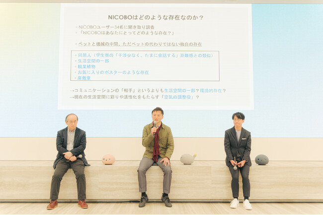 当日は、教授岡田美智男教授と勝野宏史教授を迎え、NICOBOプロジェクトリーダー・増田と「日本発家庭用ロボットのこれまでと、これから」をテーマに座談会を実施。NICOBO誕生の背景や、"役に立つ"ことよりも"そばにいてくれる存在"を目指した開発への想い、そして今後の家庭用ロボットの可能性について、熱のこもった対話が繰り広げられました。