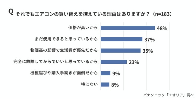 ・買い替えを控える理由は「価格が高い」(48%)、「まだ使える」(37%)、「物価高で生活費優先」(35%)