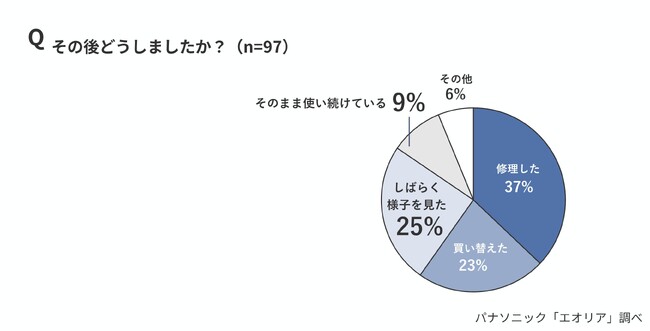 さらに、不具合に気づいた後の対応については、「修理した」(37%)、「買い替えた」(23%)に対し、「しばらく様子を見た」(25%)、「そのまま使い続けている」(9%)と、34%が十分な対応を取らないまま使用を継続している実態も明らかになりました。