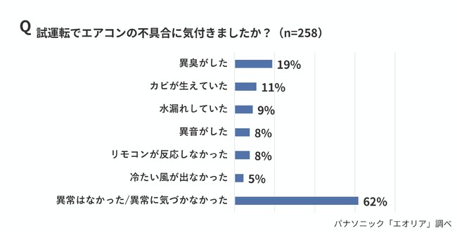 ・試運転でエアコンの不具合に気づいた人は38%、最多は「異臭」(19%)、次いで「カビ」(11%)、「水漏れ」(9%)