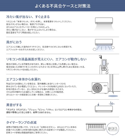 その他エアコン試運転時の不具合解決方法につきましてはパナソニックの下記公式サイトをご参照ください。 https://panasonic.jp/aircon/air_letter/news/test_run.html