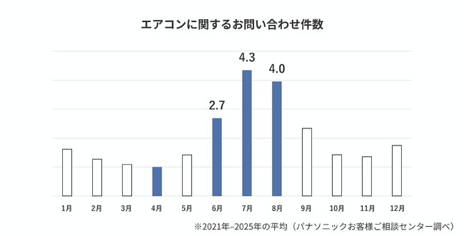 しかし、パナソニックお客様ご相談センターに寄せられるエアコンに関する相談については、例年6月~8月にお問い合わせが集中しています。過去5年(2021年~2025年)の平均では、4月のお問い合わせ件数と比較すると6月は2.7倍、7月は4.3倍、8月は4.0倍と、夏本番に向けて3倍〜4倍まで急増しています。