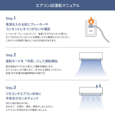 暑さが本格化し、夏の冷房シーズンに入る前には、エアコンを運転し、不具合がないか確認する「試運転」をしておくことが大切です。