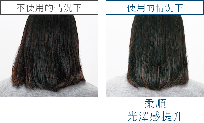 洗髮後,和日常使用的方式一樣,使用吹風機吹乾髮尾的情況下。「不使用」和「使用」搭載冷熱交替模式的吹風機「奈米水離子」的情況下的例子