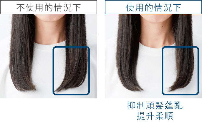 洗髮後,和日常使用的方式一樣,使用吹風機吹乾髮尾的情況下。「不使用」和「使用」搭載髮尾護理模式的吹風機「奈米水離子」的情況下的例子