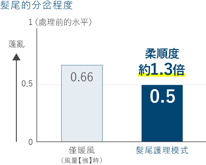 一面用手梳理頭髮,一面吹整,以熱風(風量【強】時)吹乾時的髮尾寬度變化率為0.66與以熱風(風量【強】時)吹到9成乾後,使用髮尾護理模式,吹乾髮尾(約24秒)時的髮尾寬度變化率為0.5的比較