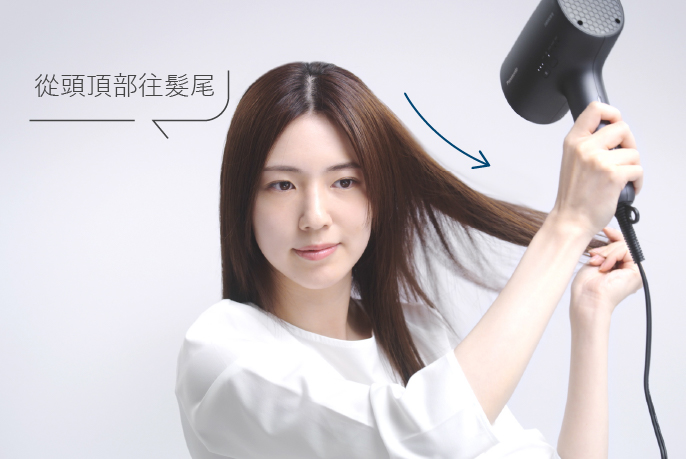 請以手指順著髮流方向梳理,從上往下吹送溫風。