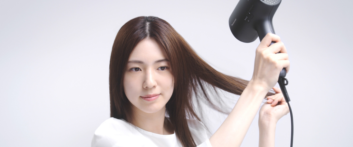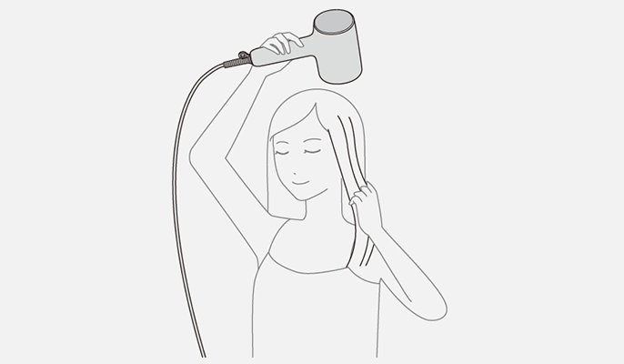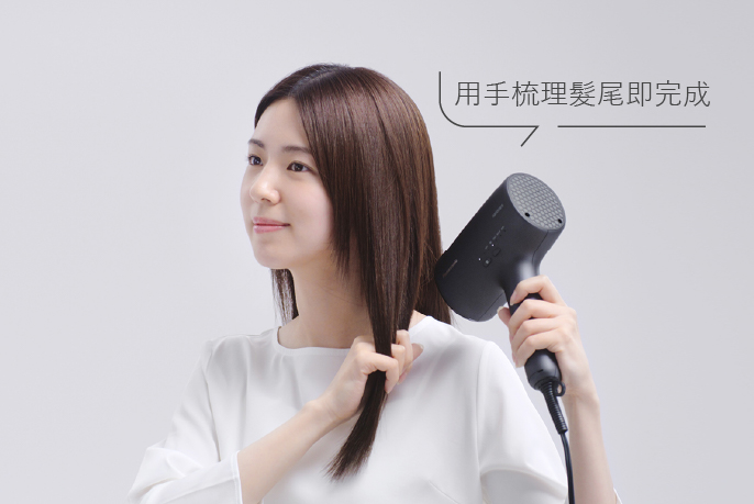 將其靠近頭髮(約5cm),用手指輕捏髮尾,從髮尾的內側和外側吹,打造美麗、有光澤又柔軟的頭髮。