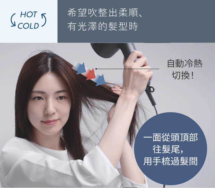 頭髮大約9成乾後,用溫度切換按鈕,選擇【冷熱標記(箭頭)】