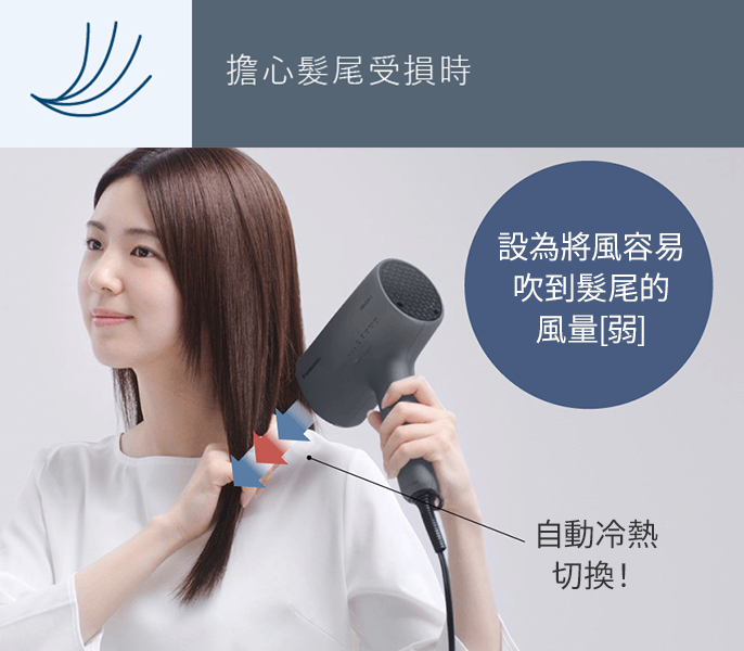 「髮尾護理模式」會以感測器自動檢知周圍的溫度,以最適當的間隔和風量,輪流產生適合吹整髮尾的熱風、冷風。因為是不易吹散髮尾的SET(弱風)風量,所以風容易吹到髮尾,能夠集中保養。