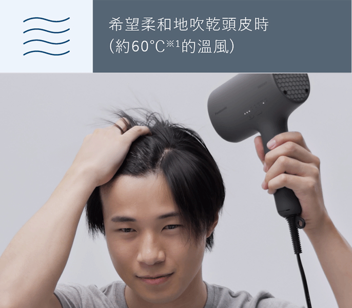 若是頭皮的表面殘留水分,就會造成黏膩等不舒服感。頭皮模式是以友善頭皮的溫度(約60 ℃※1)的風,舒適地吹乾。