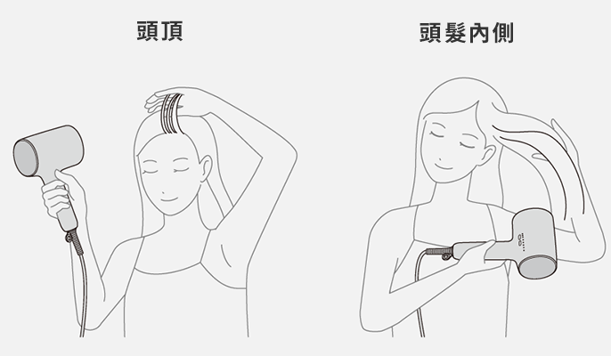 吹乾頭髮內側或後側時,為了避免頭髮被吸入,請注意不要讓頭髮覆蓋在本體上使用。