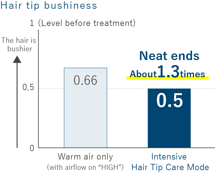 Bunches of hair were finger-combed while being dried. The ratio of hair tip spread was 0.66 when dried with warm air (with airflow on “HIGH”) as compared to 0.55 when the Intensive Hair Tip Care Mode was used as far as the hair tips (for approx. 24 sec) after the hair was 90% dried with warm air (with airflow on “HIGH”)