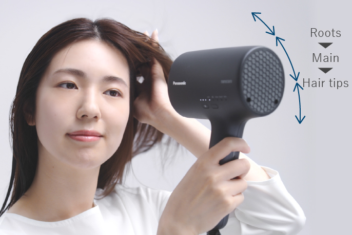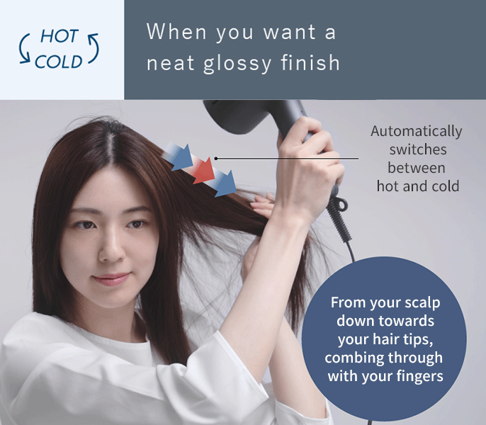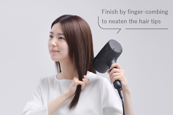 Hold the dryer closer to your hair (about 5 cm) and direct the airflow to both sides of the hair tips while finger-combing them to neaten them. This will make your hair sleek and glossy right down to the tips.