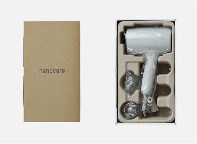 In fitting with the popular Hair Dryer nanocare, we have even paid special attention to the packaging. The packaging and cushioning materials made from pulp have been designed leveraging a paper-like texture.