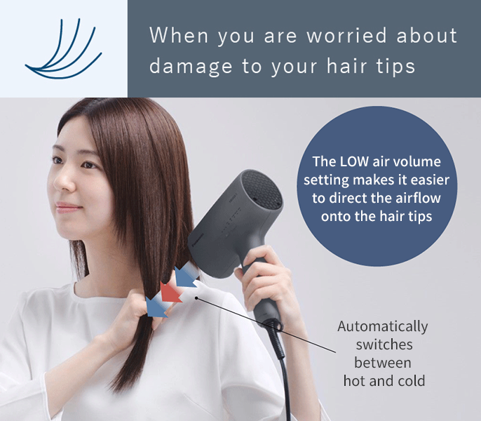 The Intensive Hair Tip Care Mode uses the sensor to automatically check the ambient temperature and alternates hot and cold airflow at the right intervals and air volume to provide the perfect finish for your hair tips. The weak flow is easy to direct and enables you to provide intensive care for all your hair tips.