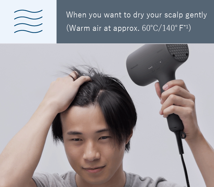 Residual moisture on the scalp surface can cause unpleasant sensations such as clamminess. Scalp Mode gently dries your scalp with pleasantly warm air at a temperature of approx. 60℃*1.