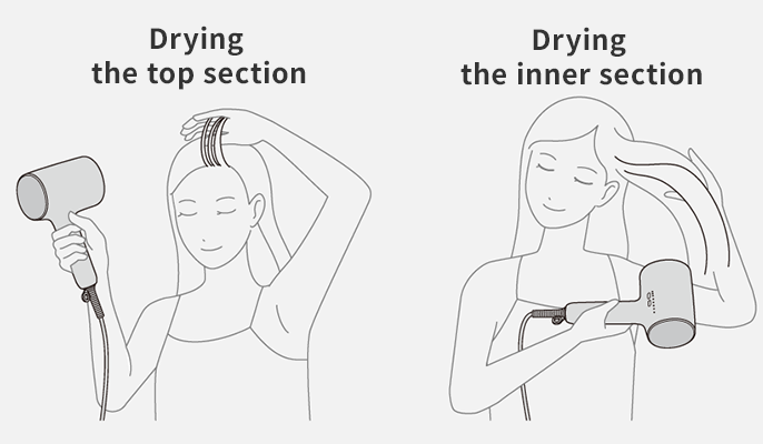 When drying the inner or back sections of your hair, be careful not to cover the main unit with hair to prevent it from being sucked in