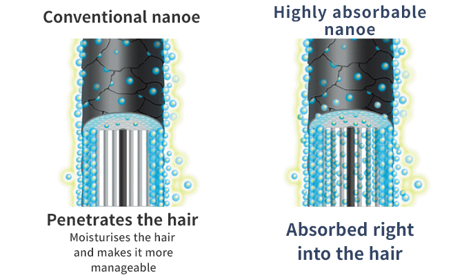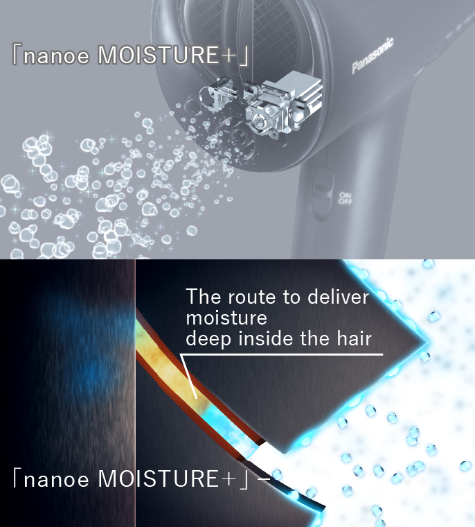 When compared with conventional nanoe, 「nanoe MOISTURE+」 is absorbed right into the hair. It delivers moisture to the inside of the hair, making it smooth to the touch.