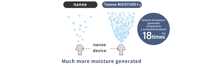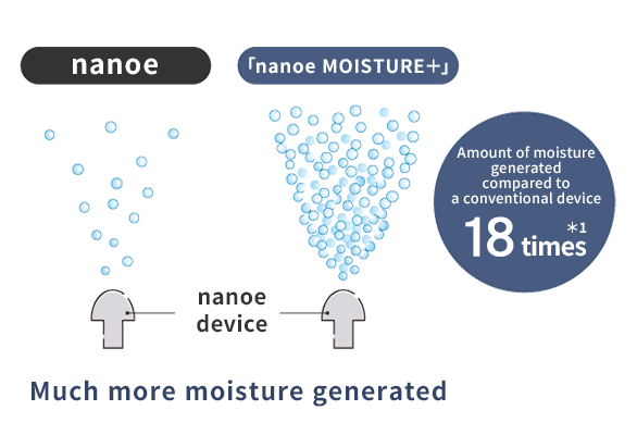 By changing the generation method, nanoe MOISTURE+ produces 18 times*1 the amount of moisture generated by conventional nanoe.