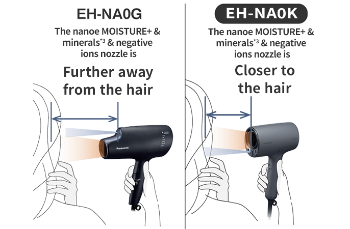 The nanoe MOISTURE+ & minerals*3 & negative ion nozzle is positioned closer to the hair, allowing airflow containing nanoe MOISTURE+ & minerals*3 & negative ions to reach the hair more easily.