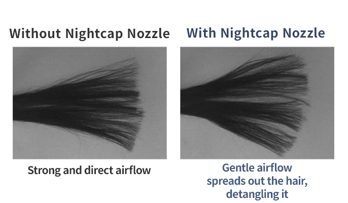 The newly added Nightcap Nozzle dries your entire hair evenly*5 , so it stays smooth and manageable, even until the next morning*4 .