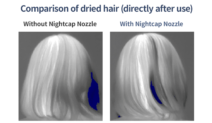 Comparison of dried hair after using EH-NA0K with and without the Nightcap Nozzle attached.