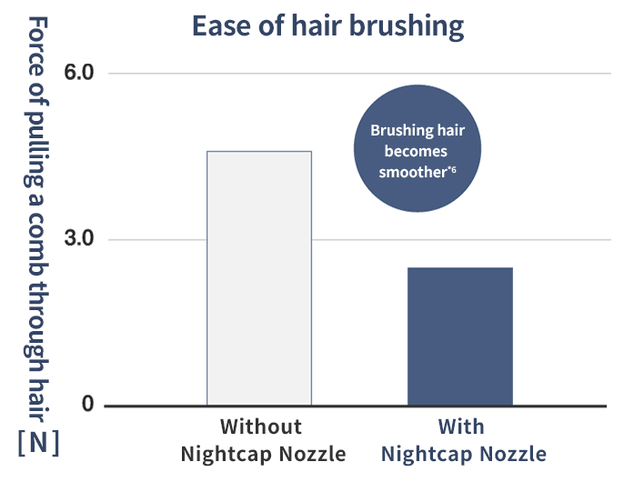 *6 Comparison of force needed to pull a comb through the hair when using or not using the Nightcap Nozzle (Panasonic research). Ease of hair brushing is when little force is needed to pull the comb through the hair