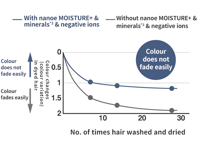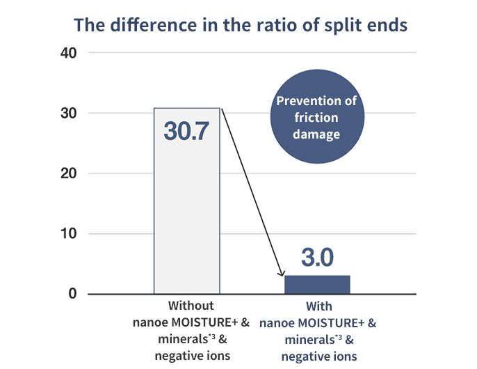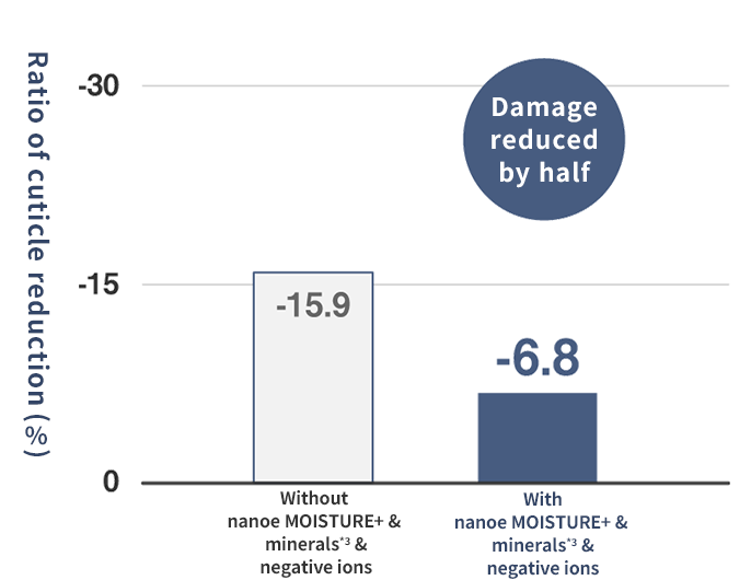 By helping protect the cuticles of colour-treated hair from fraying, nanoe MOISTURE+ & minerals*3 & negative ions reduces friction damage from brushing and, with continued use, leads to smoother hair.