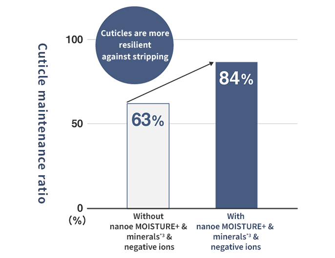 Comparison of the hair cuticle maintenance ratio when using a Hair Dryer nanocare with nanoe MOISTURE+ & minerals*3 & negative ions and a non-ionic hair dryer. Bunches of bleached hair were repeatedly washed, dried with a hair dryer and combed. The hair was rebleached every 60th cycle, and the process was carried out for a total of 180 cycles. The number of cuticles was measured and the maintenance ratio calculated. The cuticle maintenance ratios of the hairs were compared.